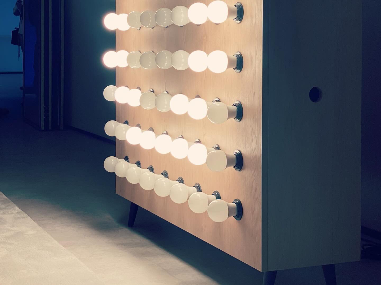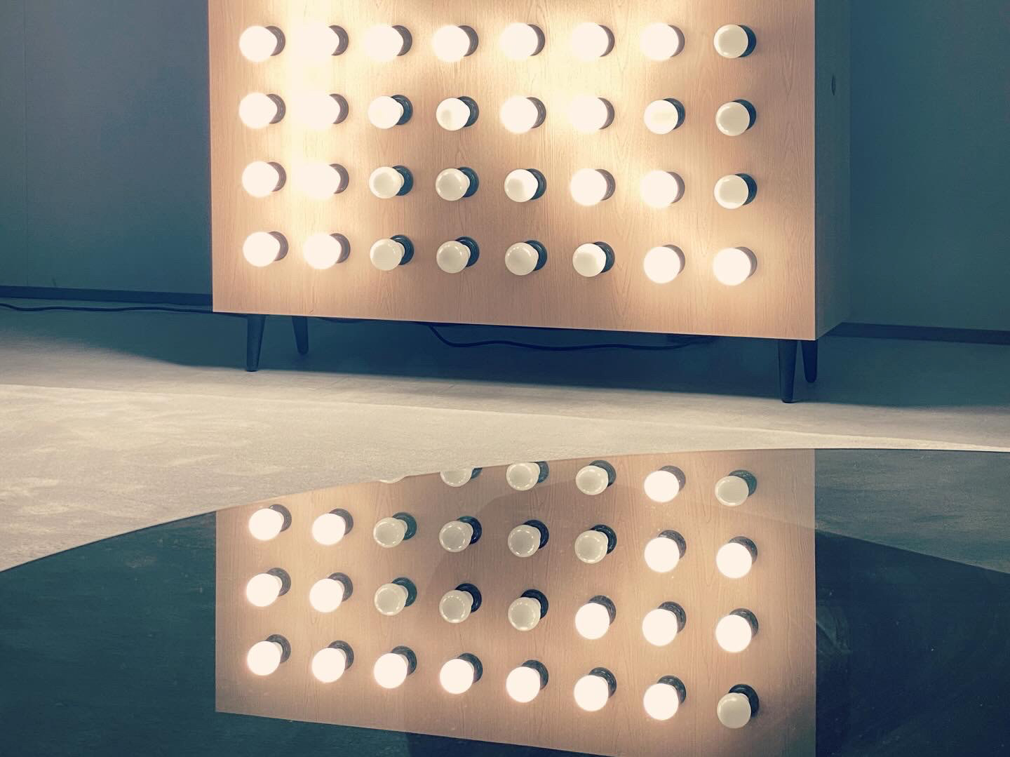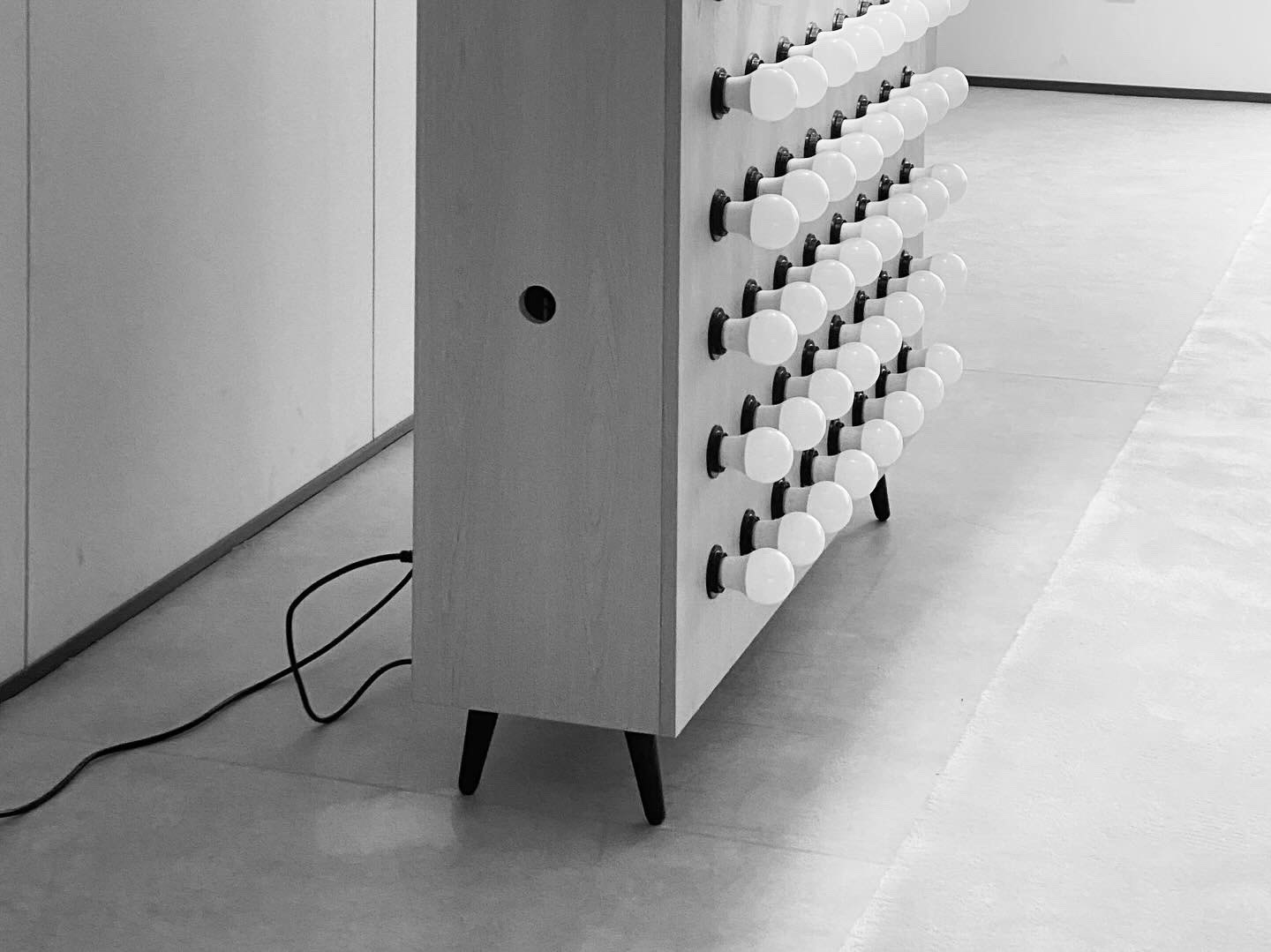 This piece retains the essence of its predecessor—64 warm white bulbs arranged in an 8x8 grid on a wooden box reminiscent of an old television—yet it removes the floor-laid wires, offering a more compact and refined presentation. The work silently displays single letters and symbols, encouraging viewers to decode meaning and engage in a form of contemplation often overshadowed by the noise of modern life.