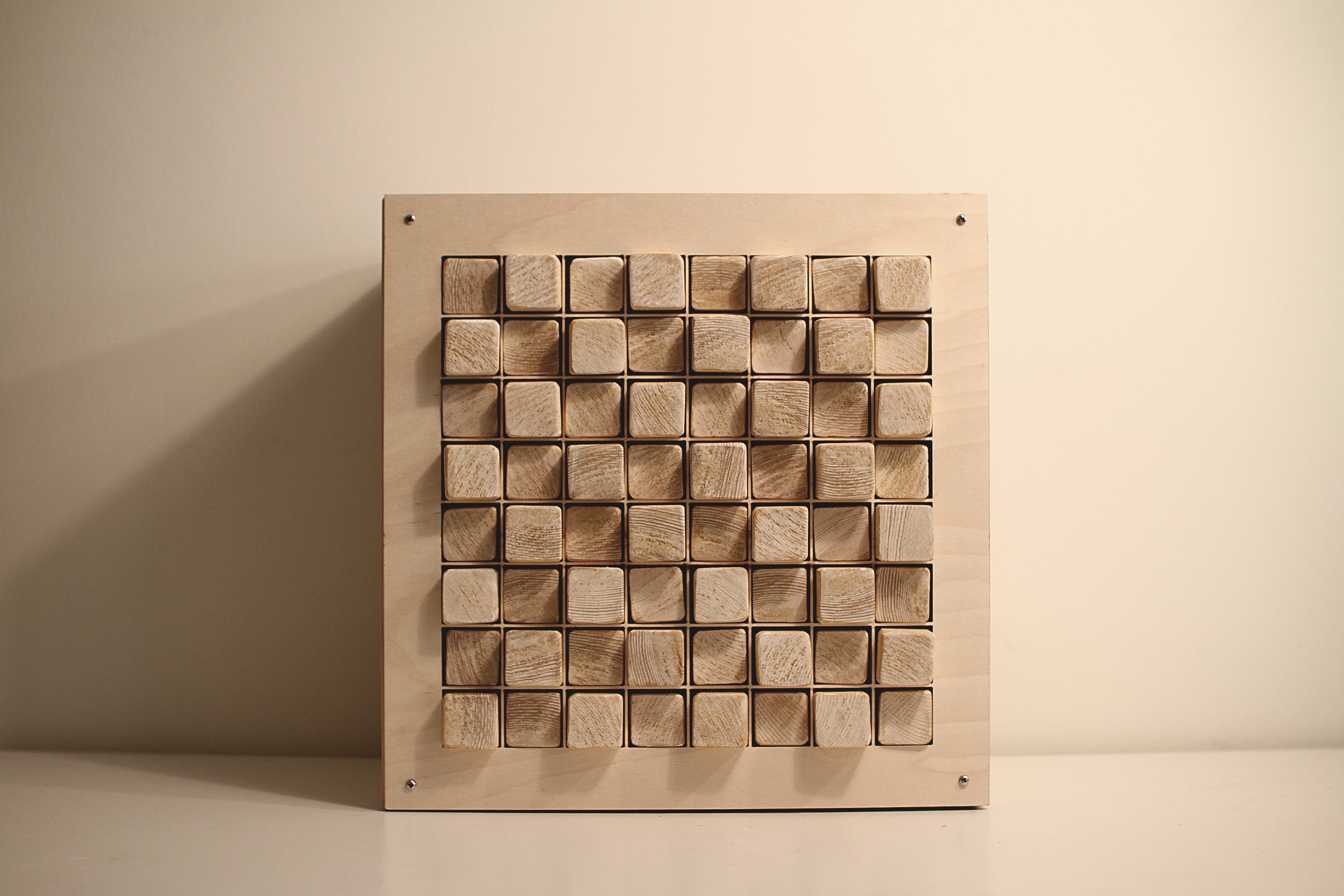Analog wooden blocks (1.5"x1.5"x3" each) as digital pixels. 64 wood pixels in 8x8 make a form. One pixel might make you bored but it gives you something interesting when pixels make a form together. This WPD64 has been presented at a generative art show in NYC.